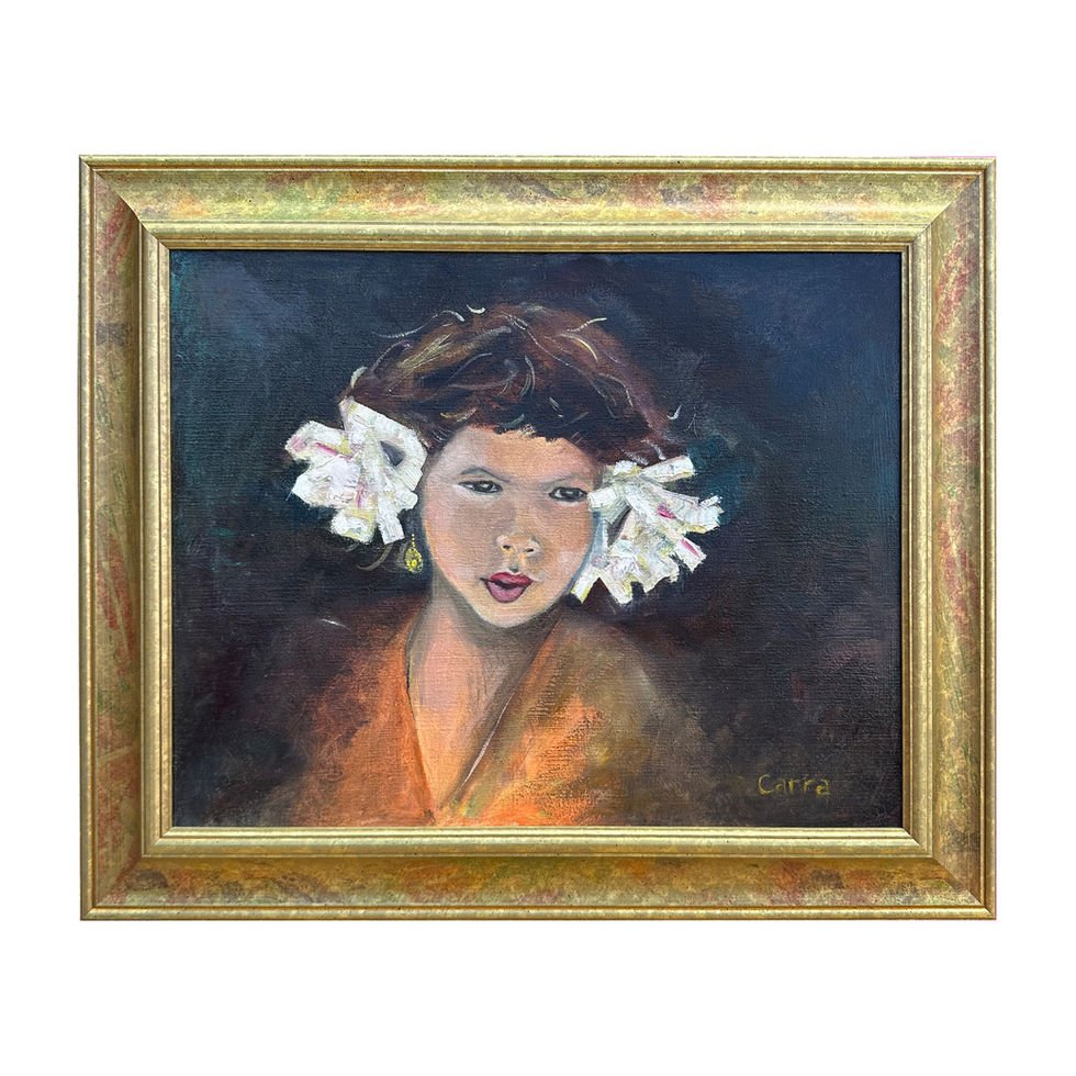 In "One Gold Earring," I sought to capture the essence of youthful beauty and mystery. The deep, moody background contrasts with the warm glow on the subject's skin, created through careful layering of earthy tones. The delicate white flowers in her hair and the single gold earring add intrigue, inviting viewers to imagine her story. My brushwork aims to balance realism with a touch of ethereal softness.