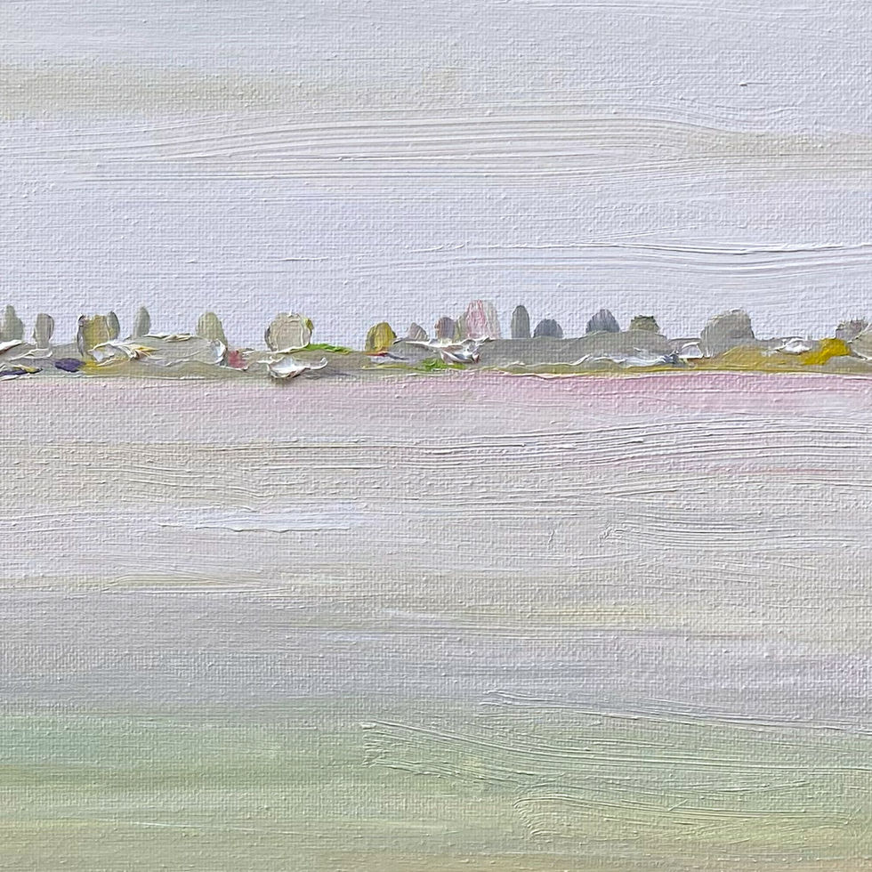 This abstract painting titled "Skyline" offers a minimalist and unusual interpretation of an urban landscape or skyline. The soft horizontal bands of color in muted shades of green, gray, and pink create a serene atmospheric effect, with small dashes along the horizon line suggesting buildings or structures in the distance. Despite its simplicity, the piece evokes a sense of tranquility and invites the viewer to appreciate the abstract beauty found in understated scenes or vistas. The muted palette and gentle brushwork give this city skyline depiction a calming, contemplative quality.